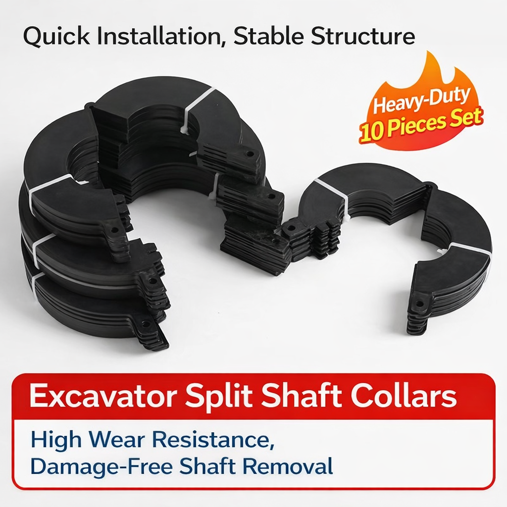 These snap-on split shaft collars are designed for securing and stabilizing shafts in heavy-duty machinery such as excavators, construction equipment, and industrial systems. The split design allows fast installation without dismantling components, making them highly practical for maintenance and on-site repairs.